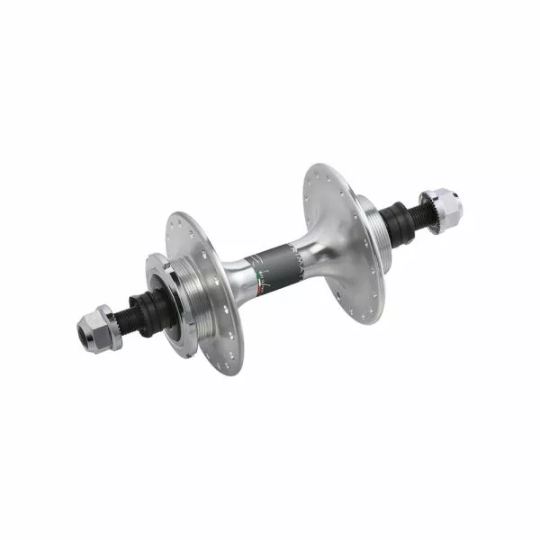 Miche baghjulsnav “Pista”, solid aksel, 10×1, industrielle lejer, høj flangehus af smedet, børstet og anodiseret aluminium, monteringsmål 120mm, med forkromede møtrikker, forkromet stål modring