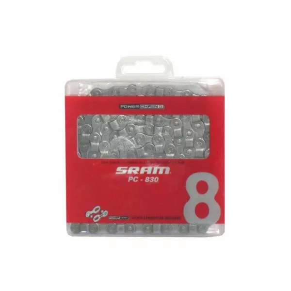 SRAM Chain PC 830 SRAM Chainns kæde til 8-, 9- eller 10-dobbelte gear er kendetegnet ved hurtig og nøjagtig skift, høj kilometervilje og lavt slid. SRAM PowerChain II giver tillid til hver eneste meter på sporet. 6/7/8-speed PowerLink-lukning
